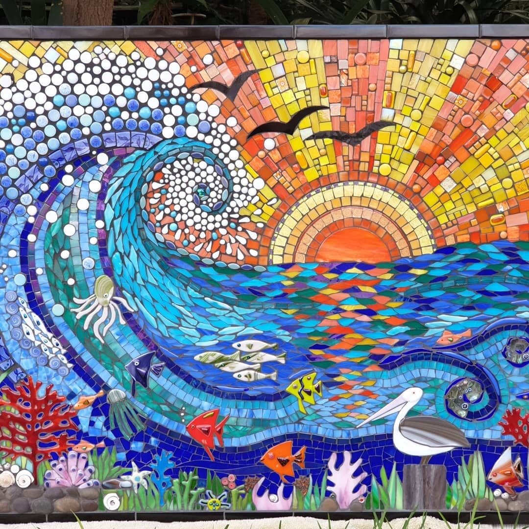 One of my proudest pieces is a large-scale mosaic depicting a stylised scene from my clients photo. The vibrant colours and intricate details capture the clients wishes, for a colourful and meaningful piece to enhance her home. Each piece was handcut from hundreds of pieces of glass or tiles. I added elements I created from either fused glass and ceramic.
