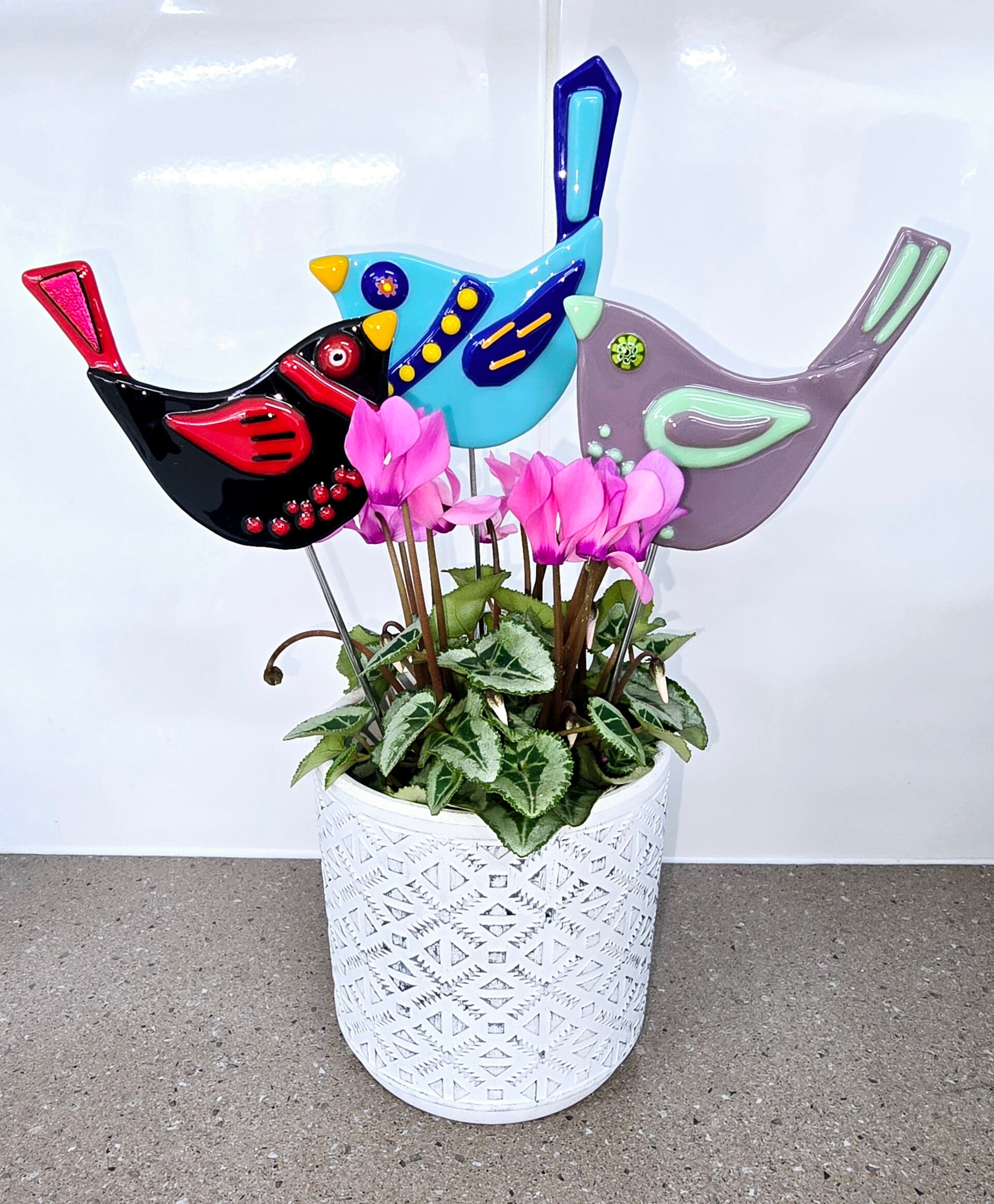 Each garden stake is hand cut and.pieced by me. I make each one unique, no two are ever the same. They are then fired in my kiln at 760⁰ for approx 10 hours. A stainless steel stake is added after firing so it can be displayed in your garden or pot plant.